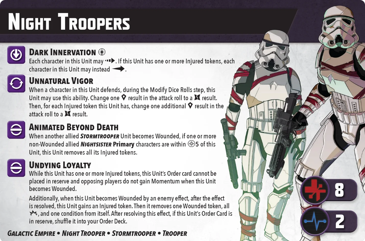 When another allied Stormtrooper Unit becomes Wounded, if one or more non-Wounded allied Nightsister Primary characters are within